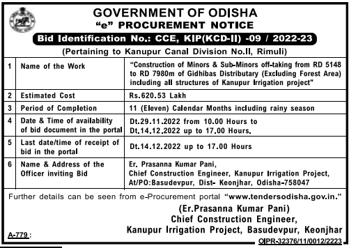Tender for “Construction of Minors & Sub-Minors off-taking from RD 5148 to RD 7980m of Gidhibas Distributary (Excluding Forest Area) including all structures of Kanupur Irrigation project”