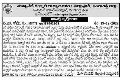 Expression of interest is sought in sealed covers from experienced consultants for preparation of detailed project report for construction of Municipal Office Building, Mini Function Hall and Multi-Purpose Auditorium in Telapur Municipality along with necessary permissions, technical sanctions from DTCP and other statutory bodies till completion of work.