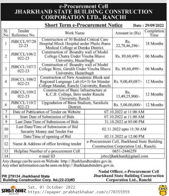 Tender for Construction of New Academic Block and Regional Language Lab (G+3) for Mandar College Mandar, Ranchi University, Ranchi