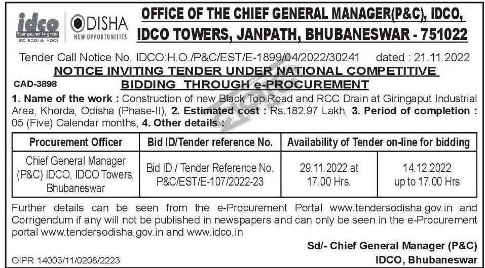 Tender for Construction of new Black Top Road and RCC Drain at Giringaput Industrial Area, Khorda, Odisha (Phase-II), 2