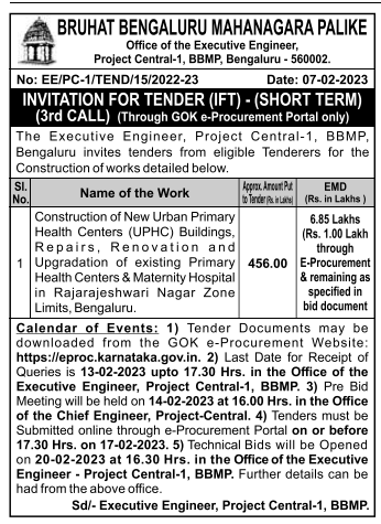 Tender for Construction of New Urban Primary Health Centers (UPHC) Buildings, Repairs, Renovation and Upgradation of existing Primary Health Centers & Maternity Hospital in Rajarajeshwari Nagar Zone Limits, Bengaluru.
