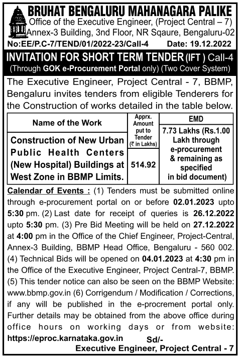 Construction of New Urban Public Health Centers (New Hospital) Buildings at West Zone in BBMP Limits.