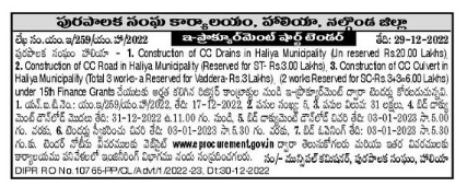 Tender for Construction of OC Drains in Haliya Municipality (Un reserved Rs.20.00 Lakhs). 2. Construction of CC Road in Haliya Municipality (Reserved for ST- Rs.3.00 Lakhs), 3. Construction of CC Culvert in Halya Municipality