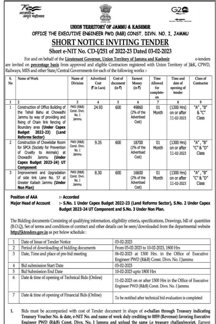 Tender for Construction of Office Building of the Tehsil Bahu at Chowadhi Jammu by way of providing and fixing of Chain link fencing of Boundary area (Under Capex Budget 2022-23) (Land Reforms Sector)