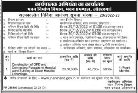 Tender for Construction of OPD and 1. Connecting Passage to Hospital ward Building at Sadar Hospital Lohardaga