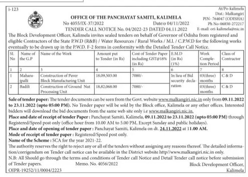 Tender for Construction of Paver Block Manufacturing Unit
