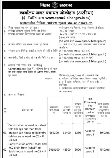 Tender for Construction of PCC road and RCC drain from PMGSY to Basik house in ward no-03 N.P Jokihat.