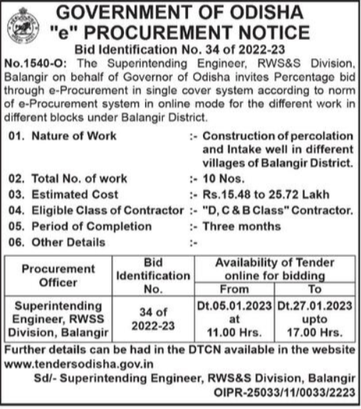 Tender for Construction of percolation and Intake well in different villages of Balangir District.