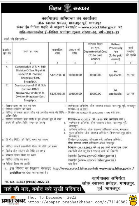 Tender for Construction of PH. Sub Division Office Narayanpur under P. H. Division Bhagalpur East, As applicable. 5125250.00 103000.00 10000.00 09 kill Bhagalpur.