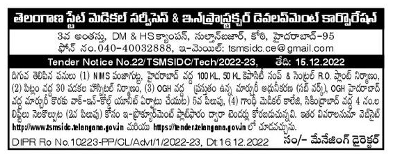 Tender for works (1) NIMS (2) Panjagutta at Pitlam, 100 KL at Hyderabad. 50 KL Capacity Sump & Central R.O. Construction of Plant, Construction of 30 Bed Hospital, (3) Modernization (Sub Work) of Existing Mortuary at OGH,