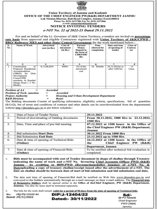 Tender for Construction of Proposed Residential Accommodation (2BKH) for Dist Development Council/PRI members And Twins Danga Leasi