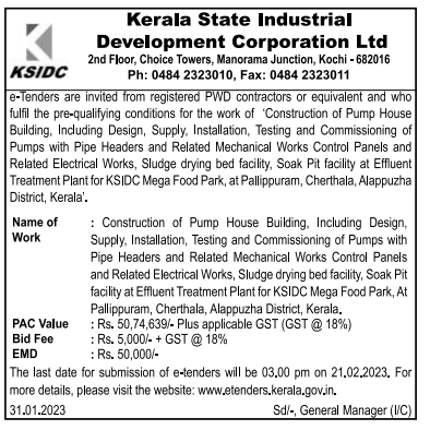 Construction of Pump House Building, Including Design, Supply, Installation, Testing and Commissioning of Pumps with Pipe Headers and Related Mechanical Works Control Panels and Related Electrical Works, Sludge drying bed facility, Soak Pit facility at Effluent Treatment Plant for KSIDC Mega Food Park, At Pallippuram, Cherthala, Alappuzha District, Kerala.