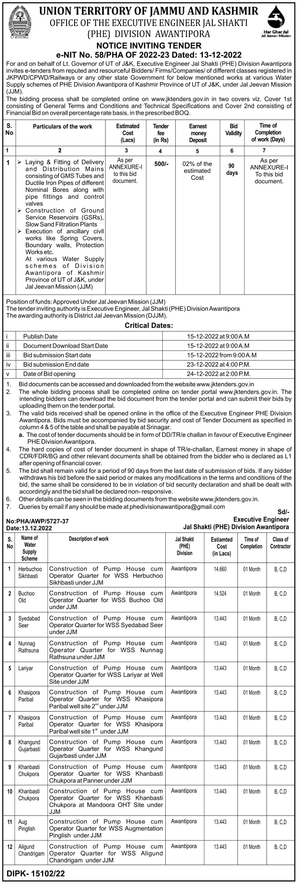 Tender for Construction of Pump House How Operator Quarter for WSS Herbuchoo Sikhbasti under JJM