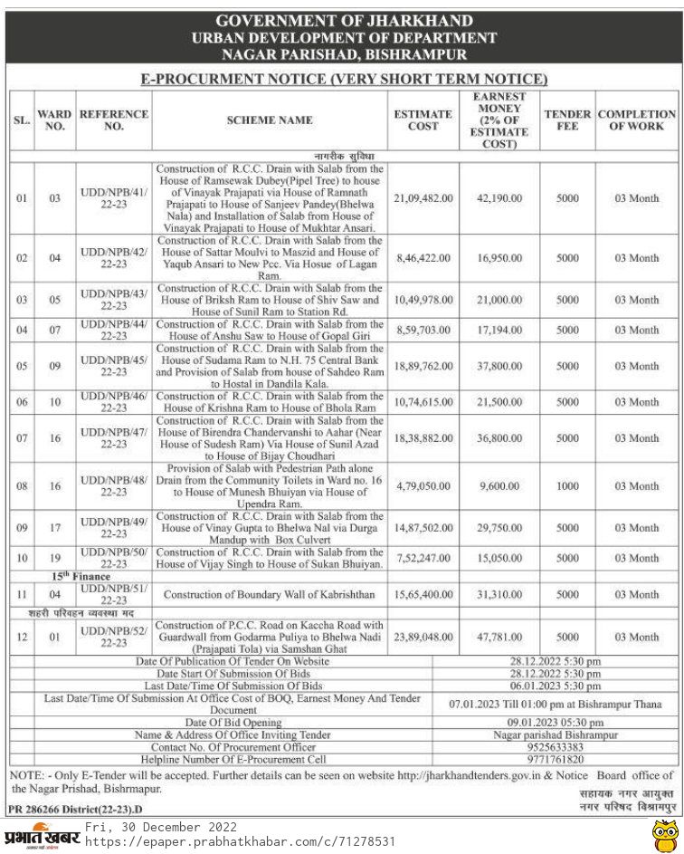 Tender for Construction of R.C.C. Drain with Salab from the House of Vijay Singh to House of Sukan Bhuiyan.
