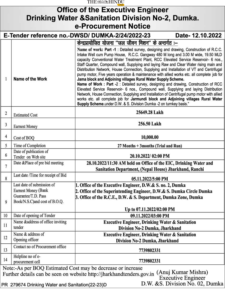 Detailed survey, designing and drawing, Construction of R.C.C. Intake Well cum Pump House, R.C.C. Gangway 480 M long and 3.00 M wide, 19.50 MLD capacity Conventional Water Treatment Plant, RCC Elevated Service Reservoir- 6 nos., Staff Quarter, Compound wall, Supplying and laying Raw and Clear Water rising main and Distribution Network, House Connection, Supplying and Installation of VT and Centrifugal pump motor, Five years operation & maintenance with allied works etc. all complete job for Jama block and Adjoining villages Rural Water Supply Scheme.