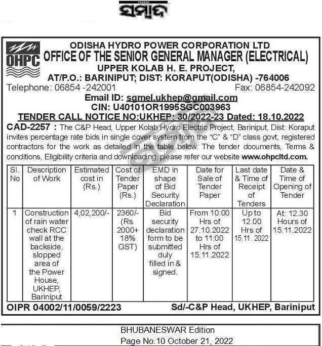Tender for Construction of rain water check RCC wall at the backside, slopped area of the Power House, UKHEP, Bariniput