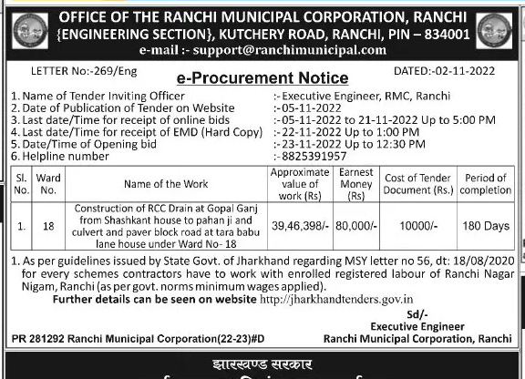 Tender for Construction of RCC Drain at Gopal Ganj from Shashkant house to pahan ji and culvert and paver block road at tara babu lane house under Ward No- 18