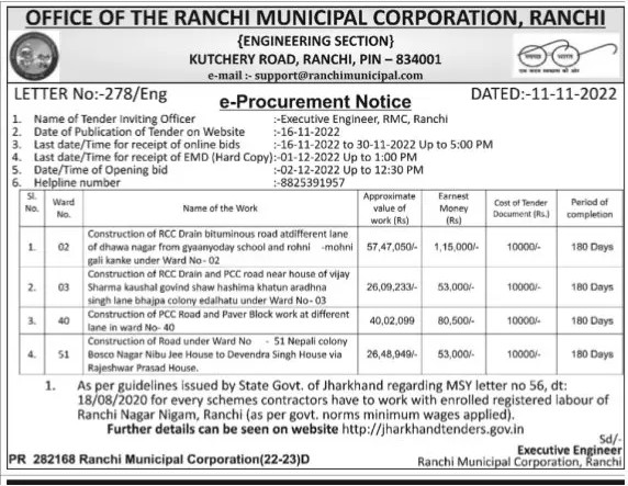 Tender for Construction of RCC Drain bituminous road atdifferent lane 1 02 of dhawa nagar from gyanyoday school and rohni mohni gali kanke under Ward No-02