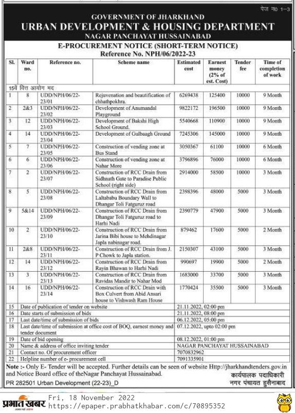 Tender for Construction of RCC Drain from Dhangar Toli Fatguruz road to Hari Nadi