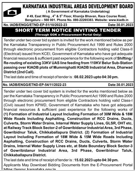 Wide Roads Including Asphalting, Construction of RCC Drains, Ducts, Culverts, Storm Water Drains, Internal Water Supply Lines, GLSR, OHT etc, at Railway Track Block Sector-2 of Gowribidanur Industrial Area, 3rd Phase, Gowribidanur Taluk, Chikkaballapura District. (2) Formation of Industrial Layout Including Formation of 18M Wide & 15M Wide Roads Including Asphalting, Construction of RCC Drains, Ducts, Culverts, Storm Water Drains, Internal Water Supply Lines etc, at State Boundary Block Sector-3 of Gowribidanur Industrial Area, 3rd Phase, Gowribidnur Taluk, Chikkaballapura District.