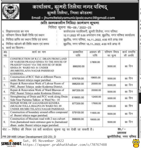 Tender for Construction of RCC Slab at different Places under Jhumri telaiya nagar parishad.