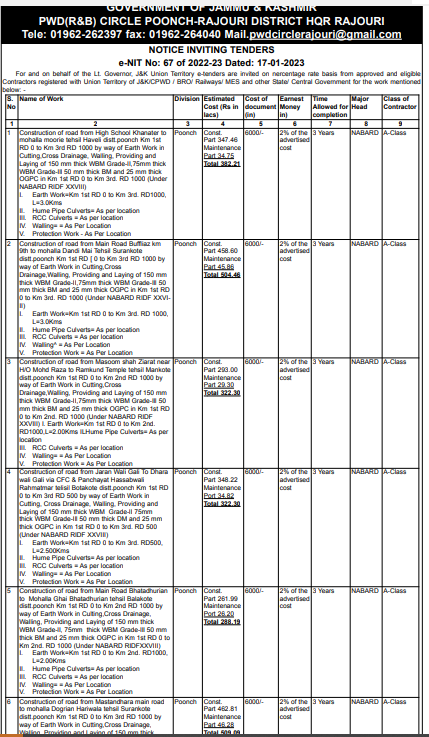 Tender for Construction of road from Masoom shah Ziarat near HIO Mohd Raza to Ramkund Temple tehsil Mankote distt poonch Km 1st RD 0 to Km 2nd RD 1000 by way of Earth Work in Cutting