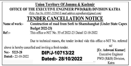 Tender for Construction of road from Serli to Shamshanghat (Under State Capex Budget 2022-23)