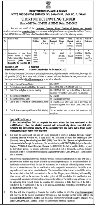 Tender for Construction of road from Sharma Resorts to Sunpan Valley, Sainik Colony Extension Chowadhi (Under Capex. Cast Budget for the year 2022-23