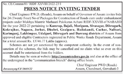 Construction of Roads cum Under Embankment Projects under Mukhya Mantrir Mathauri Pakikaran Achani RIDF-XXVIII of NABARD for the year 2022-23 pertaining to Kamrup , Bajali, Morigaon, Sivasagar, Dibrugarh, Kokrajhar, Nagaon, Jorhat, Dhubri, Goalpara, Hailakandi, Cachar, Nalbari, Karimganj, Lakhimpur, Udalguri, Dibrugarh and Darrang districts of Assam from approved and eligible Contractors registered in Public Works Roads Department, Assam