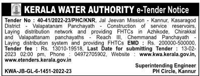 Tender for Construction of service reservoirs, Laying distribution network and providing FHTCs in Azhikode, Chirakkal and Valapattanam panchayaths Reach III, Chemmanad Panchayath – Laying distribution system and providing FHTCs