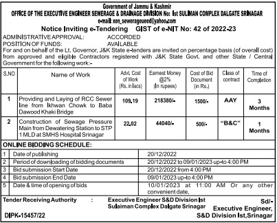 Tender for Construction of Sewage Pressure Main from Dewatering Station to STP 1 MLD at SMHS Hospital Srinagar