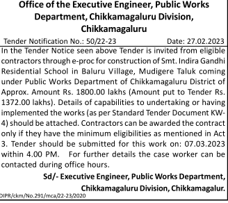 Tender for construction of Smt. Indira Gandhi Residential School in Baluru Village, Mudigere Taluk coming under Public Works Department of Chikkamagaluru District