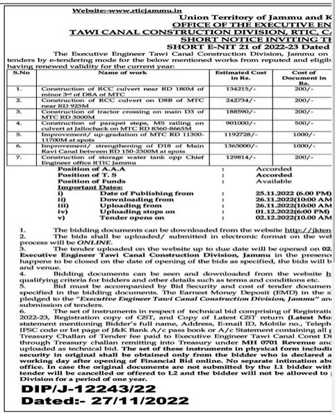 Tender for Construction of storage water tank opp Chief Engineer office RTIC Jammu