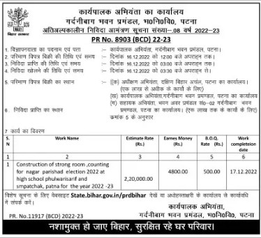 Tender for Construction of strong room.counting for nagar parishad election 2022 at high school phulwarisarif and smpatchak, patna for the year 2022-23