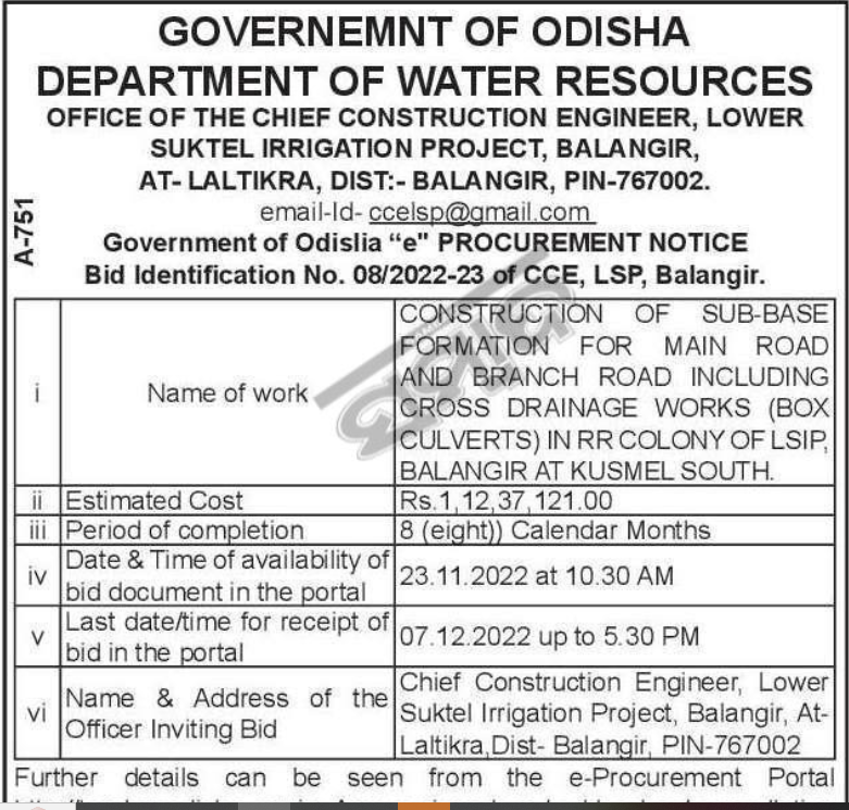 Tender for CONSTRUCTION OF SUB-BASE FORMATION FOR MAIN ROAD AND BRANCH ROAD INCLUDING CROSS DRAINAGE WORKS (BOX CULVERTS) IN RR COLONY OF LSIP, BALANGIR AT KUSMEL SOUTH.