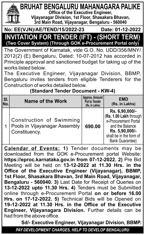 Tender for Construction of Swimming Pools in Vijayanagar Assembly Constituency