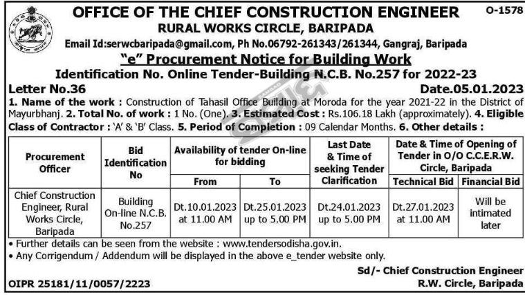 Tender for Construction of Tahasil Office Building at Moroda for the year 2021-22 in the District of Mayurbhanj. 2. Total No. of work: 1