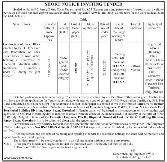 Tender for Construction of Toilet Block attached to the O.S.D.’s room and Renovation of other Toilet block of main office building at Directorate of Technical Education office, Kahilipara, Guwahati-19