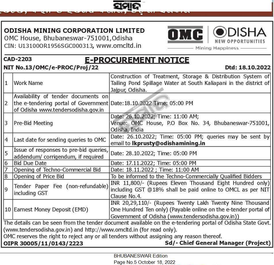 Construction of Treatment, Storage & Distribution System of Tailing Pond Spillage Water at South Kaliapani in the district of Jajpur, Odisha.