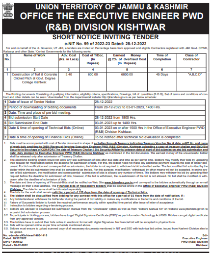Tender for Construction of Turf & Concrete Cricket Pitch at Govt Degree College Kishtwar