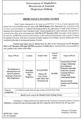 Tender for Construction of Twin cottages, Swimming pool, Bandasal, Nokpante, Nokachik, Food court, Jacuzzi, Camping Platform,