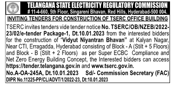 construction of Vidyut Niyantran Bhavan at Kalyan Nagar, Near CTI, Erragadda, Hyderabad consisting of Block -A (Stilt + 5 Floors) and Block-B (Stilt + 2 Floors) as per Super ECBC Compliance and Net Zero Energy Building Concept,