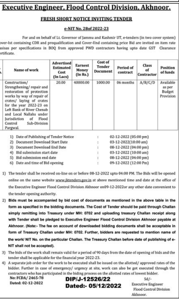 Tender for Construction/ Strengthening/repair and restoration of protection works by way of repair of crates/ laying of crates for the year 2022-23 on Left Bank of River Chenab and Local Nallahs under Jurisdiction of Flood Control Sub-Division Pargwal.