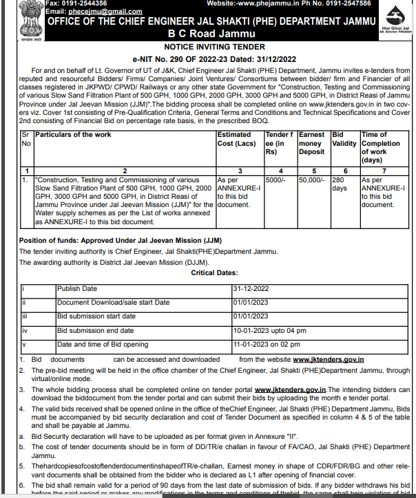 of various Slow Sand Filtration Plant of 500 GPH, 1000 GPH, 2000 GPH, 3000 GPH and 5000 GPH, in District Reasi of Jammu