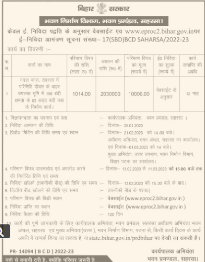 Tender for Construction work of 03 no. of prisoners with a capacity of 198 prisoners in the land available outside the boundary wall of Mandal Jail, Saharsa.