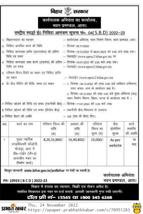 Tender for Construction work of D-Type (G+3) residential building at Chief Judicial Magistrate Colony, Bhojpur, Ara.