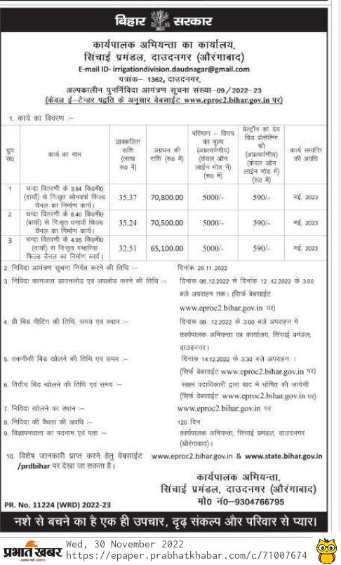 Tender for Construction work of Gamharia field channel originating from 4.95 km (right) of Chanda distributary.