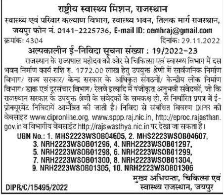 Short term e-tender notice number: 19/2022-23 On behalf of the Governor of Rajasthan, the construction work of ten buildings in the Medical and Health Department amounting to Rs. 1772.00 Lakhs from the registered experienced contractors in Public Works Department / State Government / Central Government authorized organizations / Central Public Works Department / Posts and Telecom Department / Railways etc. in the appropriate category, which is equivalent to the appropriate category of the Rajasthan Government.