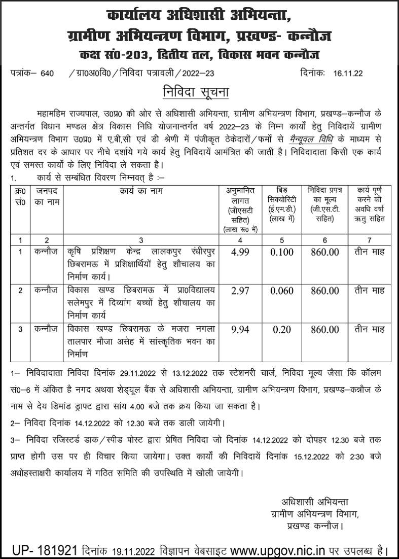 Tender for Construction work of toilet for trainees at Agricultural Training Center Lalakpur Randhirpur Chibramau.