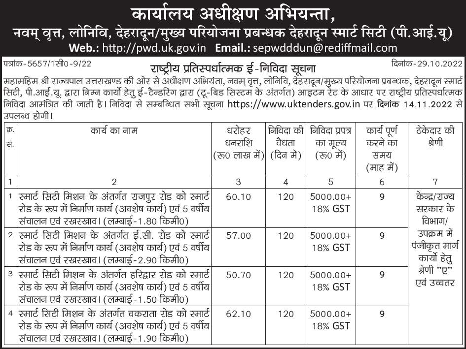 Tender for Construction work (remaining work) and 5 years operation and maintenance of Rajpur Road as Smart Road under